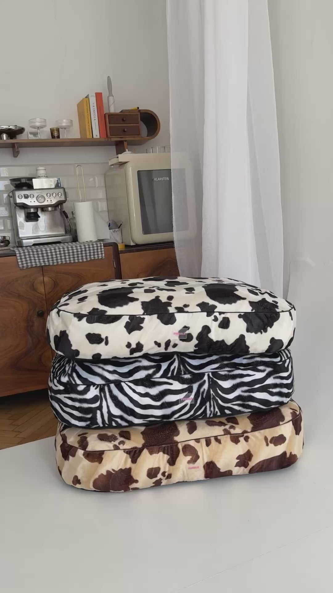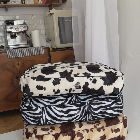 Czarno-biały wzór krówki nadaje legowisku nowoczesny charakter, a miękki velour otula psa przyjemną w dotyku powierzchnią, idealną do codziennego relaksu.