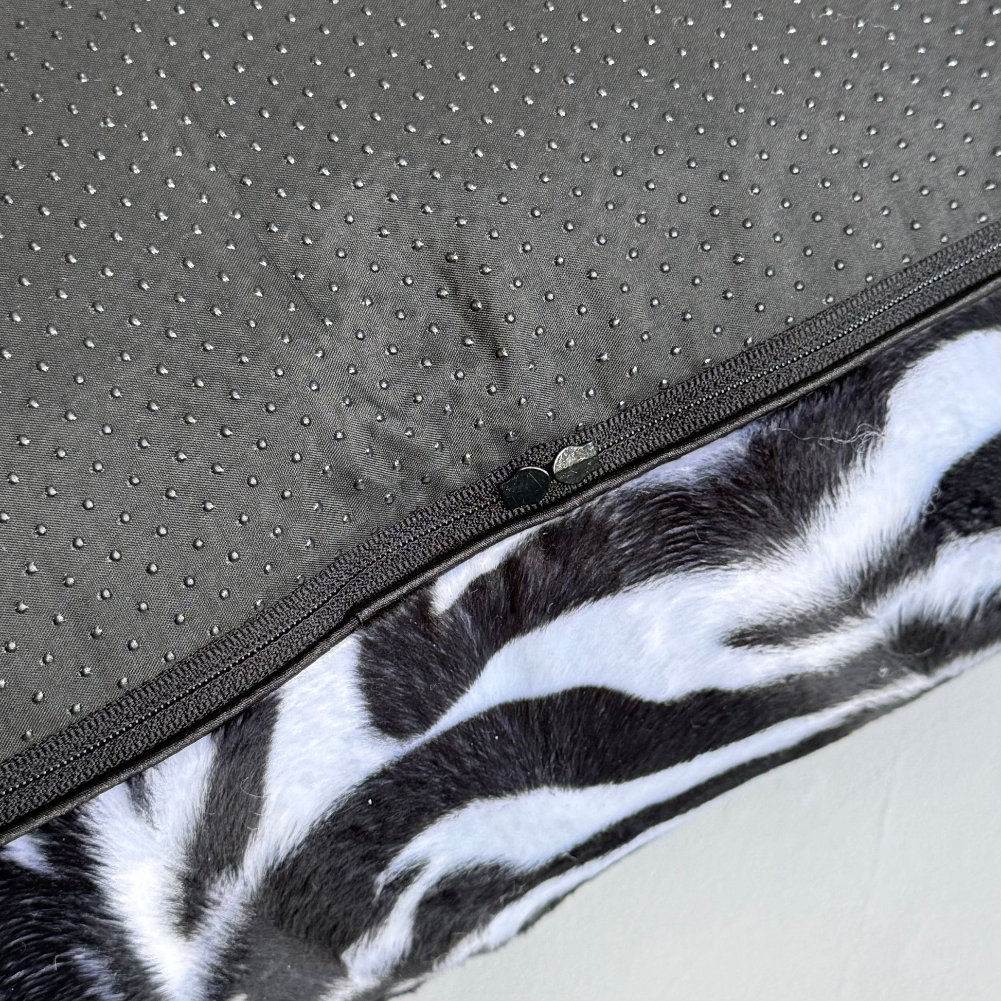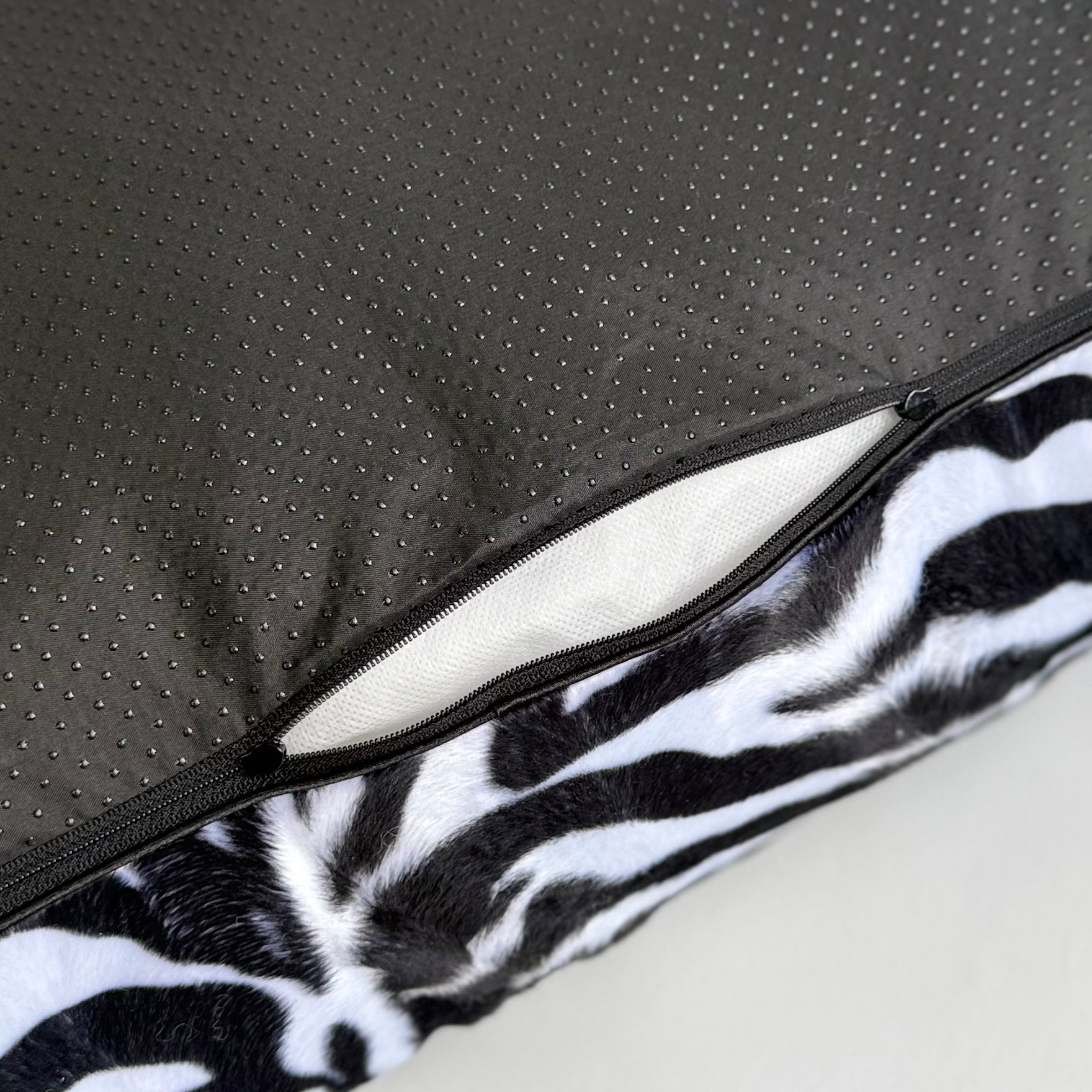 Czarno-biały wzór zebra nadaje legowisku nowoczesny charakter, a miękki velour otula psa przyjemną w dotyku powierzchnią, idealną do codziennego relaksu.